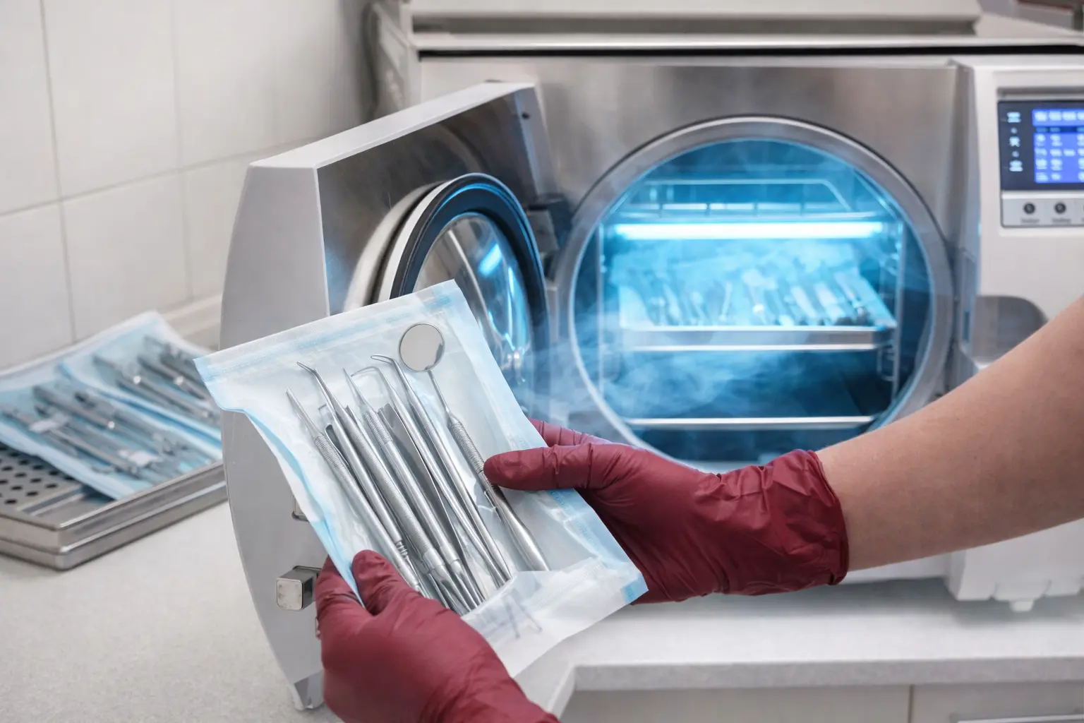Instruments undergo ultrasonic cleansing, sterilized in Class B autoclaves, sealed in labeled pouches with time, date and batch code. A digital tracking log is maintained for every pouch used.