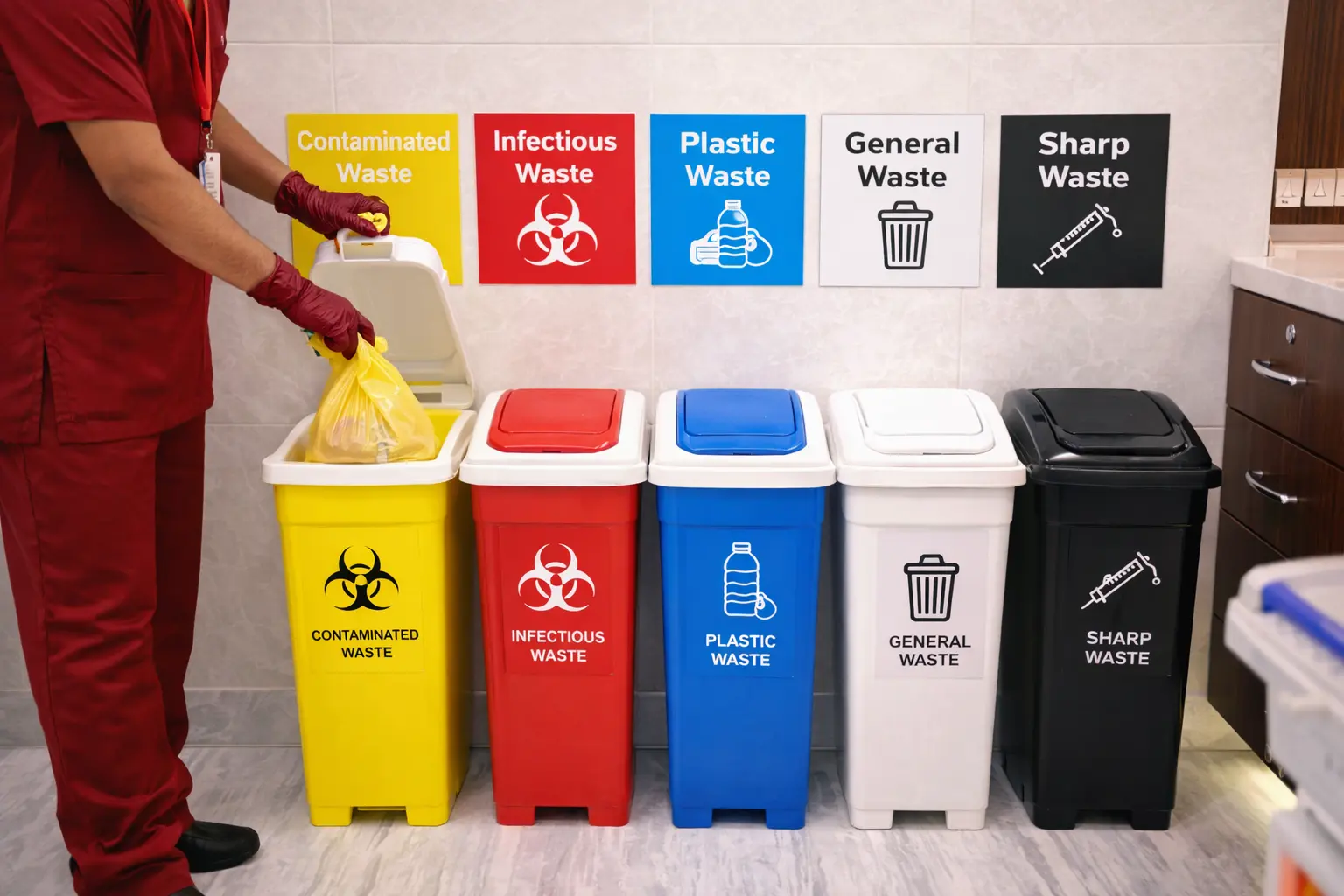 Color-coded waste segregation, sealed containers, government-authorized disposal, and daily digital logs ensure zero negligence.